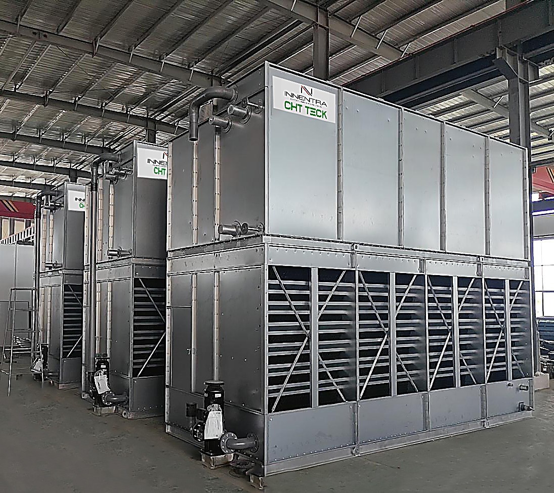 Condensadores evaporativos que cumplen con las más estrictas normativas medioambientales. Una solución confiable, eficiente y de calidad para proyectos industriales. Fabricados en acero galvanizado Superdyma, acero inoxidable SS304, 316L… Con separador de gotas de super PVC con ratios inferiores a 0,001%.